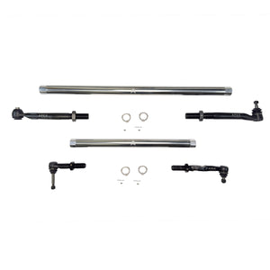 A direct replacement extreme duty Tie Rod and Drag Link assembly to replace your underperforming OE steering. Oversized tie rod and drag link ends, connected by massive DOM, Polished Aluminum or Black Aluminum adjusting sleeves, eliminates death wobble and tightens up steering under the most extreme conditions. Weak adjusting sleeves are replaced via tie rod and drag link ends threading directly into the connecting rods and secured by: